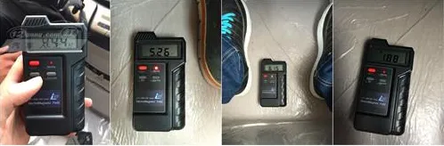 & o: g$ h) {/ g$ y 上图为车辆匀速20km/h时,主驾驶、副驾驶、主驾驶后排、副驾驶后排的辐射值分别为4.44μT、5.26μT、6.15μT、1.88μT。整体来看数值与手机接到电话的数字相近。 + T$ y& @8 n' n, n' I