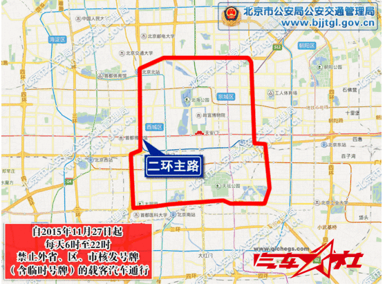 二环路主路(全线),每天6时至22时,禁止外省、区、市核发号牌(含临时号牌)的载客汽车通行。