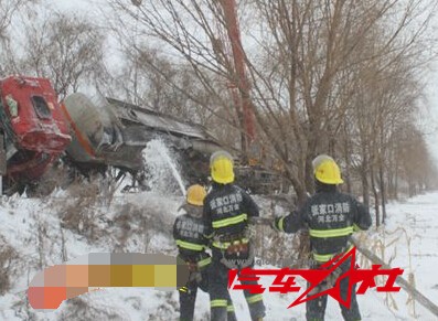 事故现场。 11月22日5时许,在张家口市万全县白郭线旧堡乡路段,一辆满载32吨甲醇罐车侧翻起火,火势处于初级阶段,无人员被困,请求紧急救援。 接到报警后,张家口市公安消防支队万全县中队立即出动一辆A类泡沫车、一辆水罐车及20名消防官兵火速赶赴现场。途中,中队指挥员第一时间紧急向支队指挥中心汇报现场情况;同时中队通讯员及时向万全县公安局指挥中心汇报,公安交警、环保等部门立即前往协同联动处置。距离火灾现场还有7公里时下起了大雪,对现场火灾扑救及增援力量到场增加了很大难度。 到达现场后,中队指导员立即对到场力量进行部署,警戒组迅速携带反光桶等警戒器材划定警戒区,实施双向交通管制,禁止任何车辆和人员通过。经靠前侦查发现甲醇罐车成南北方向“侧躺”在公路边上,轮胎部位起火、罐体下方甲醇泄漏起火并形成流淌火,夹杂着滚滚浓烟直上云霄,火焰高达约2米,呈蓝紫色,不时发出“扑哧、扑哧”的响声。 5时36分,根据现场情况,大队指挥员立即令灭火组分为2个战斗小组,,一组在罐车东侧利用A类泡沫消防车出一支泡沫枪直击泄露处蓝紫色火焰及流淌火,强力打压火势;第二组利用水罐车出一只水枪快速扑灭轮胎火势并对罐体进行冷却。防止罐体温度过高爆炸。这样左右两边形成了合力夹击态势。 6时22分,指挥员令两个战斗小组灵活变换阵地位置,全力消灭残余零星火苗,派一名班长及两名战斗员利用铁锹筑堤防止泄漏的甲醇扩散。6时13分火势得到有效控制。 8时41分,全勤指挥部、特勤中队及盛华东路中队到达现场,在现场搜寻余火,同时进行泡沫覆盖。指挥员和交警积极协调吊车、清障车救援,快速排除了险情。 11时15分,导罐成功。 12时12分,事故罐车在万全县中队消防官兵的泡沫枪掩护下被吊起并复正位,顺利放在清障车上。随后,灭火组出水枪对泄露在地面上的甲醇液体进行了大面积冲洗、稀释和挖土掩埋,确定危险被排除后。于12时28分,收整器材归队。