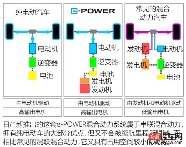 g8 g( J# A% \$ u. W5 a在日本的三大车企中,丰田的THS混合动力系统、本田的i-MMD混合动力系统以及日产自己的Hybrid车型均使用的是混联混合动力系统,而本次日产推出的e-POWER则是市场上较少见的串联混合动力系统,发动机仅用来为电池充电,并不直接参与驱动车辆。 ● 日产e-POWER混合动力系统