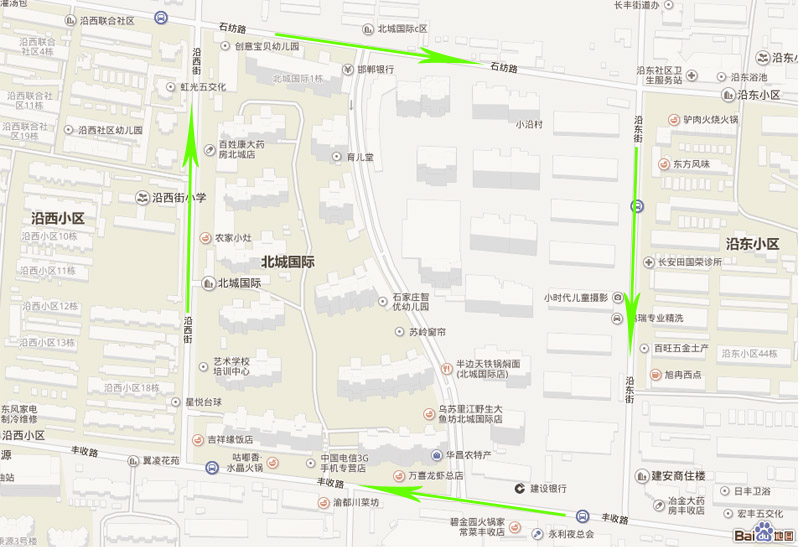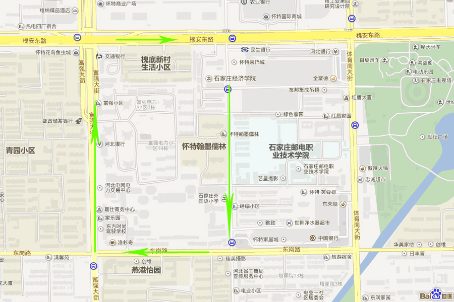 此前新设的单行道(2014年) 1、支农路(师范街-槐安路),只允许机动车由北向南通行; 2、南小街(裕华路-自强路),只允许机动车由南向北通行; 3、城角街(工农路-裕华路),只允许机动车由南向北通行; 4、九中街(和平路-市庄路),只允许机动车由南向北通行; 5、栗康街(园明路-健康路),只允许机动车由南向北通行; 6、北安街(和平路-宁安路),只允许机动车由北向南通行; 7、正东路(大经街-平安大街),只允许机动车由西向东通行; 8、园明路(平安大街-大经街),只允许机动车由东向西通行; 9、翔翼路(友谊大街-西三庄街),只允许机动车由东向西通行; 10、富强大街与槐安路交口南北两侧匝道分别设置单行道。 (槐安路南侧东匝道只允许机动车由南向北通行、西匝道只允许机动车由北向南通行;槐安路北侧东匝道只允许机动车由南向北通行、西匝道只允许机动车由北向南通行。) 1 ` y! U# P4 ~, X5 p$ \% I