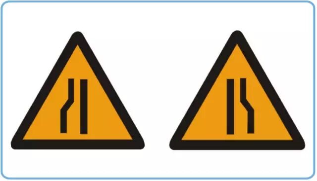 - j# R9 Y8 b. G 连续弯路标志设在有连续三个以上弯路的道路以前适当位置,提醒车辆要注意减速慢行。 左/右侧变窄标志